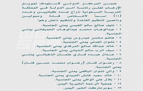 The Kingdom of Saudi Arabia representing in State Security Presidency imposed sanctions on 11 individuals and 2 entities, targeting leaders, financiers, and facilitators of the ISIL in Yemen (ISIS-Y) and al-Qa’ida in the Arabian Peninsula (AQAP).